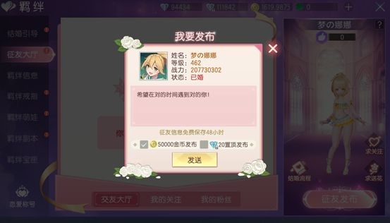 1. 可選擇消耗金幣或者綁鉆進(jìn)行發(fā)布征友信息,消耗綁鉆發(fā)布的信息可置頂。