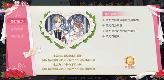角色達(dá)到180級(jí)可以開啟誓約簽訂,親密度達(dá)到9 即可和心儀對(duì)象簽訂誓約,舉辦婚禮。