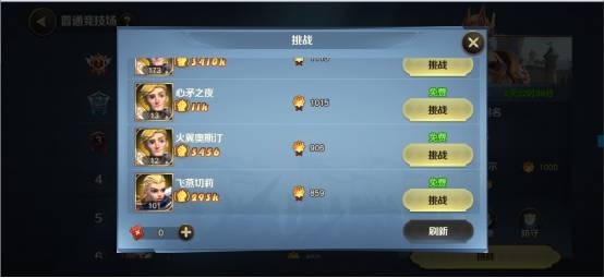 玩家開始競技場挑戰后可以在隨機匹配的4名其他玩家中選中1名作為對手,同時玩家可以提前看到對手的英雄以及布陣,所以適當調整站位是玩家大幅度提高勝率的秘訣。