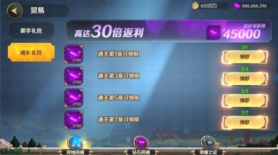 1、成長禮包,成長禮包的獎勵是超值的,普通充值的128元獲得的鉆石有2560鉆而且是在首充翻倍的情況下,而成長禮包有高達(dá)30倍的鉆石獎勵,總計(jì)45000鉆石比普通充值高出15倍!,并且成長禮包是根據(jù)玩家推圖進(jìn)度開放獎勵的,這樣可以讓玩家有一個目標(biāo)性,而不是盲目的充值消費(fèi)。