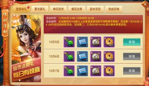 活動說明:登錄豪禮來相送,全民齊狂歡!活動期間,100級以上的玩家登陸游戲即可領取登錄獎勵!