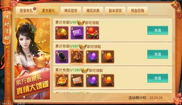 活動說明:累充送豪禮,真情大回饋,活動期間累計充值達到指定元寶,即可領取多倍經驗卡、翅膀潛能丹,極品時裝幻化等豐厚大禮!
