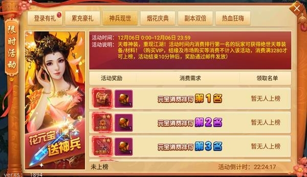 大雪紛飛活動限時開放,12月6日-12月8日開啟大雪紛飛活動,活動期間每日登陸均有好禮相送,累計充值更有額外大禮,副本雙倍掉落限時開啟,快速沖級就是這么簡單。慶典煙花,幸運豪禮爆爆爆!(新服首周設有豐富的開服活動,暫不開啟該活動)