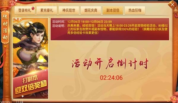 活動說明:活動期間內,第一天經驗翻倍,第二、三天特定副本雙倍掉落,道具獎勵超爽翻倍!