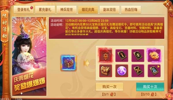 活動說明:活動期間內花費50元寶購買并使用活動道具“慶典煙花”,即有機會獲得高級翅膀、法寶、高級寶石、裝備套裝石等眾多豪華大禮。超值慶典煙花,等你來爆!