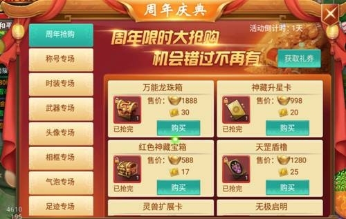 活動內(nèi)容:活動時間內(nèi),使用“11兌換券”和元寶可以在多個專場購買珍惜道具和外觀,多種道具限時出售,你想要的,這都有!
