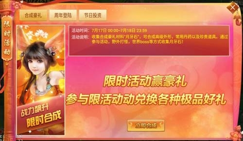 活動內(nèi)容:通過參加活動、野外打怪和打世界boss等方式收集的月牙石可以合成高級外形、常用丹藥以及珍惜道具。