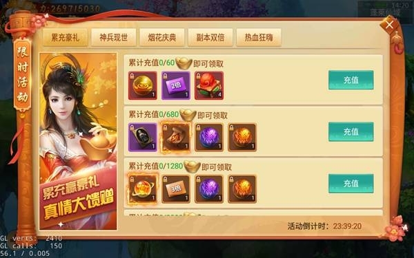 活動(dòng)說(shuō)明:累充送豪禮,真情大回饋,活動(dòng)期間累計(jì)充值達(dá)到指定元寶,即可領(lǐng)取多倍經(jīng)驗(yàn)卡、翅膀潛能丹,極品時(shí)裝幻化等豐厚大禮!