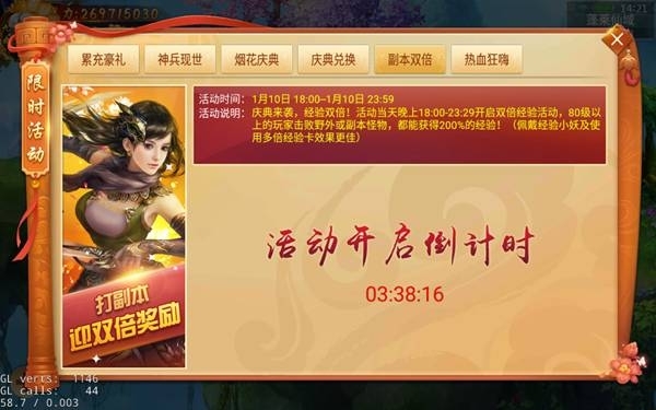 活動(dòng)說(shuō)明:活動(dòng)期間內(nèi),第一天經(jīng)驗(yàn)翻倍,第二、三天特定副本雙倍掉落,道具獎(jiǎng)勵(lì)超爽翻倍!