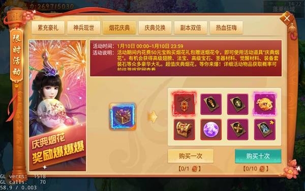 活動(dòng)說(shuō)明:活動(dòng)期間內(nèi)花費(fèi)50元寶購(gòu)買(mǎi)并使用活動(dòng)道具“慶典煙花”,即有機(jī)會(huì)獲得高級(jí)翅膀、法寶、高級(jí)寶石、裝備套裝石等眾多豪華大禮。超值慶典煙花,等你來(lái)爆!