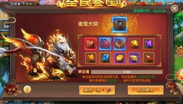 活動(dòng)說(shuō)明:活動(dòng)期間,可以花費(fèi)50元寶進(jìn)行鑒寶,鑒寶一次增加一點(diǎn)幸運(yùn)值,幸運(yùn)值越高中獎(jiǎng)幾率越高,幸運(yùn)值滿必開(kāi)大獎(jiǎng)。大獎(jiǎng):珍貴坐騎-迅影灼獅