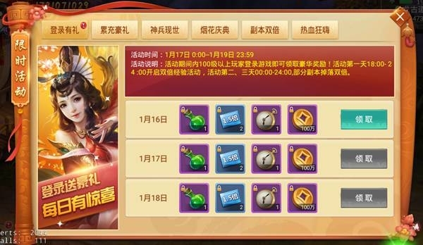 活動說明:登錄豪禮來相送,全民齊狂歡!活動期間,100級以上的玩家登陸游戲即可領取登錄獎勵!
