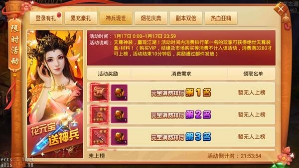 活動說明:天尊神裝,重現江湖!活動時間內消費排行第一名的玩家可獲得天尊自選箱(唯一產出),第二名可獲得極品飾品,三四五名可獲得極品紅裝?。ɑ顒咏Y束后通過郵件發放)