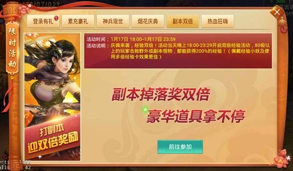 活動說明:活動期間內,第一天經驗翻倍,第二、三天特定副本雙倍掉落,道具獎勵超爽翻倍!