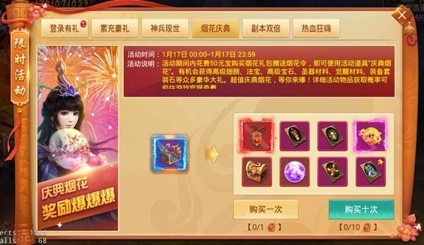 活動說明:活動期間內花費50元寶購買并使用活動道具“慶典煙花”,即有機會獲得高級翅膀、法寶、高級寶石、裝備套裝石等眾多豪華大禮。超值慶典煙花,等你來爆!