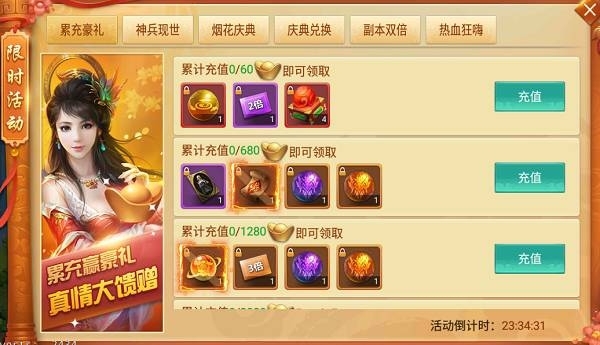 活動說明:累充送豪禮,真情大回饋,活動期間累計充值達到指定元寶,即可領取多倍經驗卡、翅膀潛能丹,極品時裝幻化等豐厚大禮!
