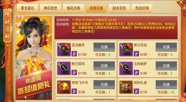 活動說明:收集活動道具“三角梅花”兌換豐厚大禮!擊殺世界首領、首領之家、天魔秘境有幾率獲得非綁定的三角梅花!野外和離線掛機也有機會獲得綁定的三角梅花!