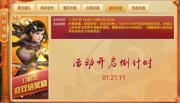 活動說明:活動期間內,第一天經驗翻倍,第二、三天特定副本雙倍掉落,道具獎勵超爽翻倍!