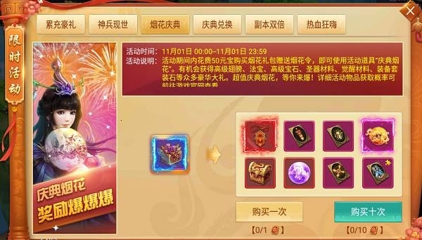 活動說明:活動期間內花費50元寶購買并使用活動道具“慶典煙花”,即有機會獲得高級翅膀、法寶、高級寶石、裝備套裝石等眾多豪華大禮。超值慶典煙花,等你來爆!