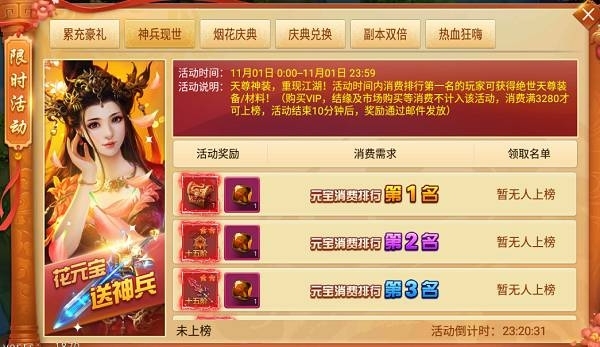 活動說明:天尊神裝,重現江湖!活動時間內消費排行第一名的玩家可獲得絕世天尊裝備(唯一產出),第二名可獲得極品飾品,三四五名可獲得極品紅裝!(活動結束后通過郵件發放)