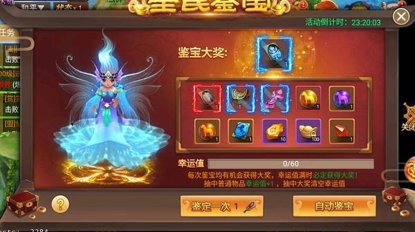 活動說明:活動期間,可以花費50元寶進行鑒寶,鑒寶一次增加一點幸運值,幸運值越高中獎幾率越高,幸運值滿必開大獎。大獎:珍貴寵物-藍靈靈