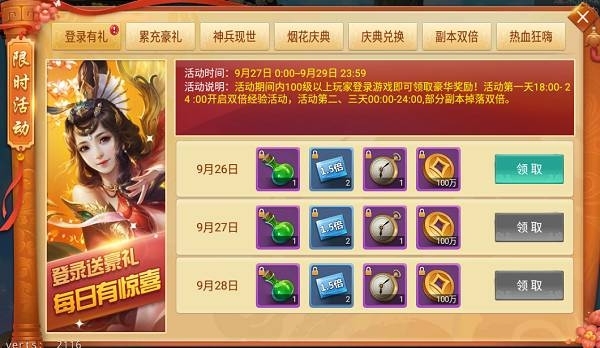 活動說明:登錄豪禮來相送,全民齊狂歡!活動期間,100級以上的玩家登陸游戲即可領取登錄獎勵!