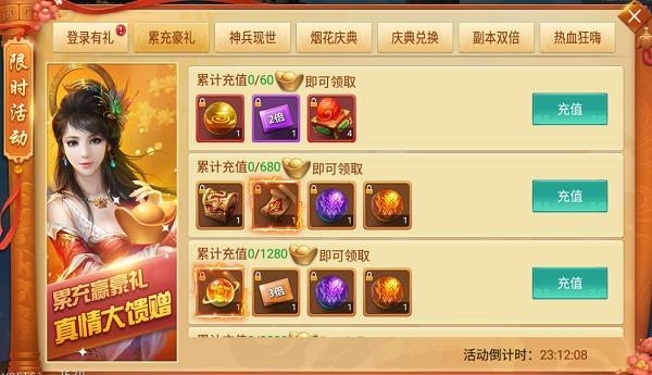 活動說明:累充送豪禮,真情大回饋,活動期間累計充值達到指定元寶,即可領取多倍經驗卡、翅膀潛能丹,極品時裝幻化等豐厚大禮!