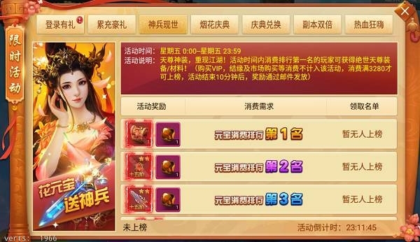 活動說明:天尊神裝,重現江湖!活動時間內消費排行第一名的玩家可獲得天尊自選箱(唯一產出),第二名可獲得極品飾品,三四五名可獲得極品紅裝!(活動結束后通過郵件發放)