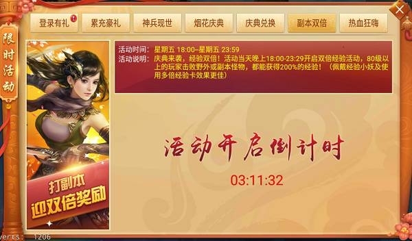 活動說明:活動期間內,第一天經驗翻倍,第二、三天特定副本雙倍掉落,道具獎勵超爽翻倍!