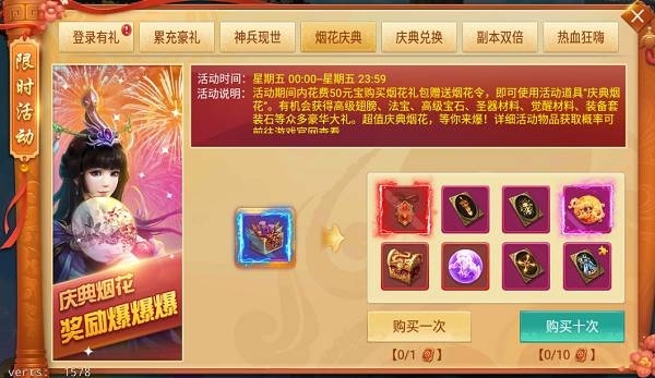 活動說明:活動期間內花費50元寶購買并使用活動道具“慶典煙花”,即有機會獲得高級翅膀、法寶、高級寶石、裝備套裝石等眾多豪華大禮。超值慶典煙花,等你來爆!