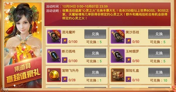活動說明:收集活動道具“心靈之火”兌換豐厚大禮!擊殺世界首領、首領之家、天魔秘境有幾率獲得非綁定的心靈之火!野外和離線掛機也有機會獲得綁定的心靈之火!