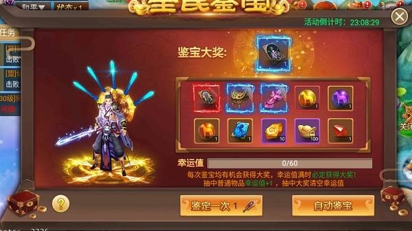 活動說明:活動期間,可以花費50元寶進行鑒寶,鑒寶一次增加一點幸運值,幸運值越高中獎幾率越高,幸運值滿必開大獎。大獎:珍貴寵物-逍遙劍仙